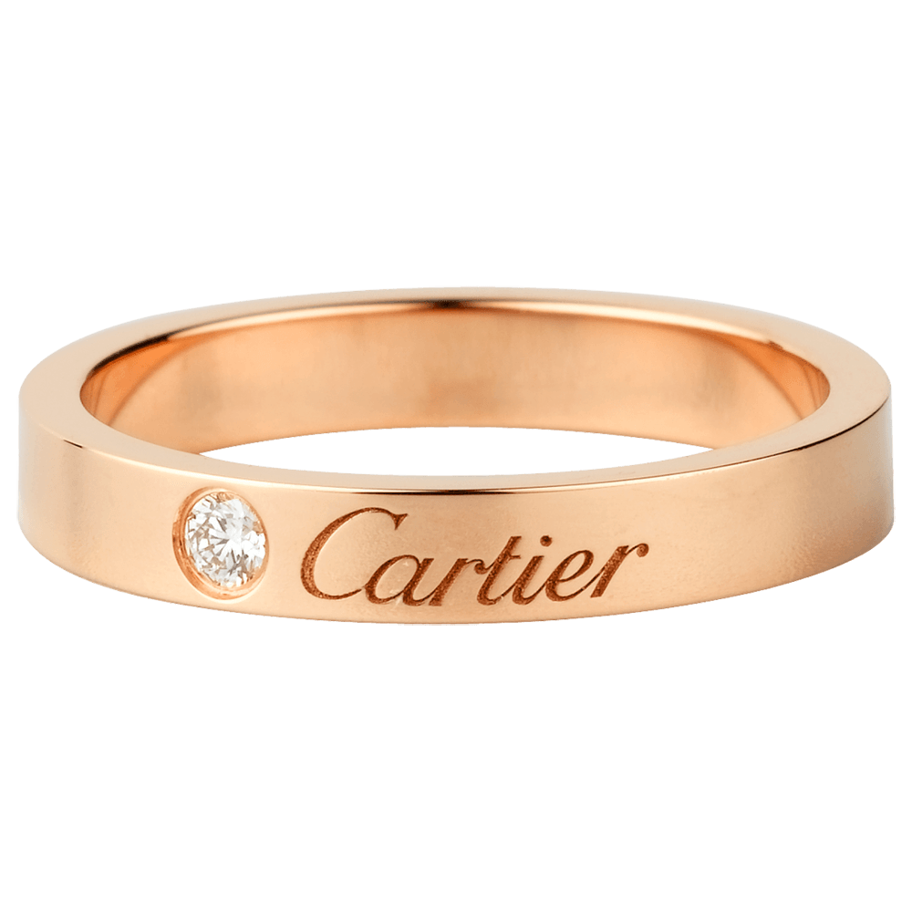 Alianza C de Cartier, 4 mm de ancho, oro rosa de 18 quilates, engastada con un diamante talla brillante con un total de 0,03 quilates.