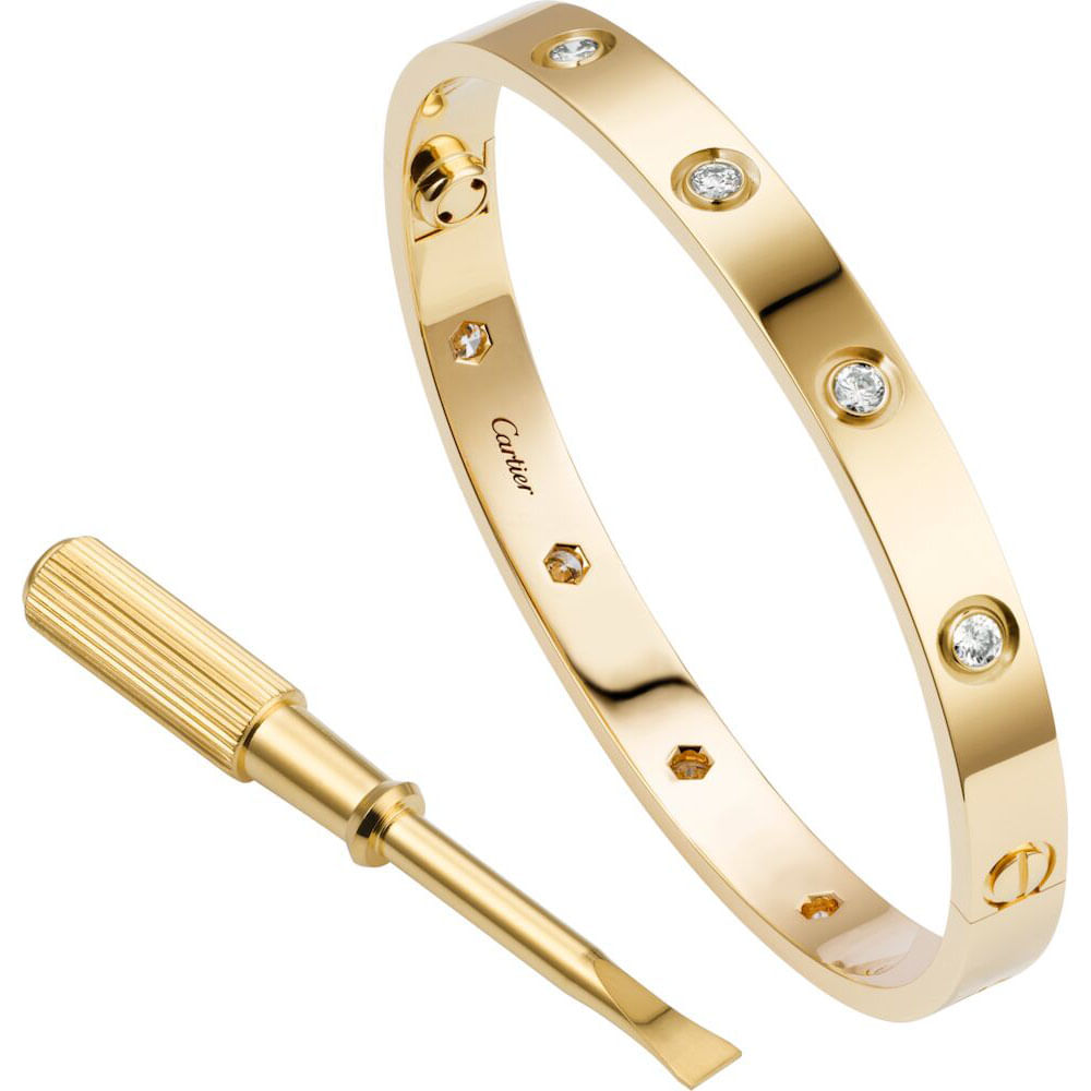Pulsera LOVE, oro amarillo 750/1000, engastada con 10 diamantes talla brillante con un total de 0,96 quilates. Incluye el destornillador. Ancho: 6,1 mm. Creada en Nueva York en 1969, la pulsera LOVE es un icono de diseño joyero: una pulsera oval, compuesta por dos arcos rígidos, que se luce ajustada en torno de la muñeca y se retira con un destornillador concreto. El sistema de cierre consta de dos tornillos funcionales situados en ambos lados de la pulsera: necesitarás la ayuda de otra persona para abrirla o cerrarla. Para determinar la talla de tu pulsera LOVE, mide tu muñeca y añade un centímetro a tu talla para lucirla ajustada o dos centímetros para un ajuste más holgado.