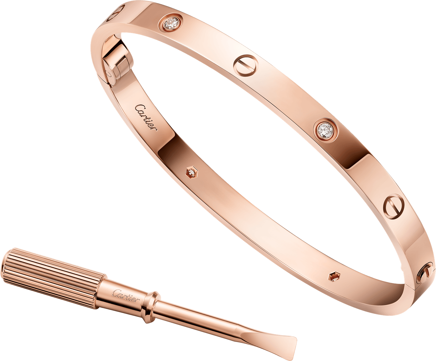 Nacida en Nueva York en los años 1970, la joya LOVE sella los amores liberados de convenciones. Sus tornillos gráficos, su óvalo ideal y su elegancia evidente hacen de ella el emblema atemporal de los amores pasionales. Puntuada de diamante, oro amarillo u oro rosa ¿hasta dónde llegaría por amor? Oro rosa 750/1000. Engastado con 4 diamantes talla brillante con un total de 0,19 quilates, Ancho: 4,8 mm. Sistema de cierre: un tornillo funcional y una bisagra. Incluye el destornillador Oro rosa, diamante