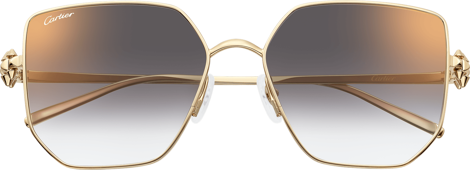 Gafas de sol Clash de Cartier con montura de metal, acabado dorado liso, forma cuadrada y lentes gris degradado efecto espejo dorado. Dimensiones: lentes 56 mm, puente 17 mm, varillas 135 mm.