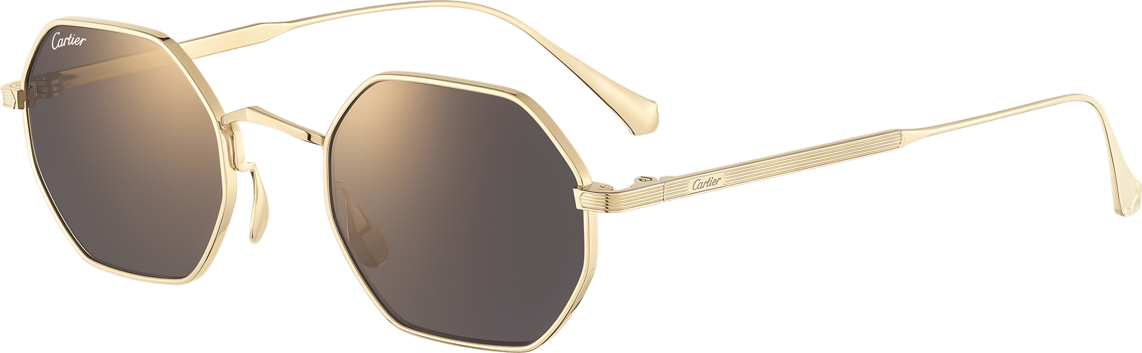 Gafas de sol Signature C de Cartier, titanio acabado dorado liso, forma hexagonal y lentes grises efecto espejo dorado. Dimensiones: lentes 48 mm, puente 22 mm, varillas 145 mm.
