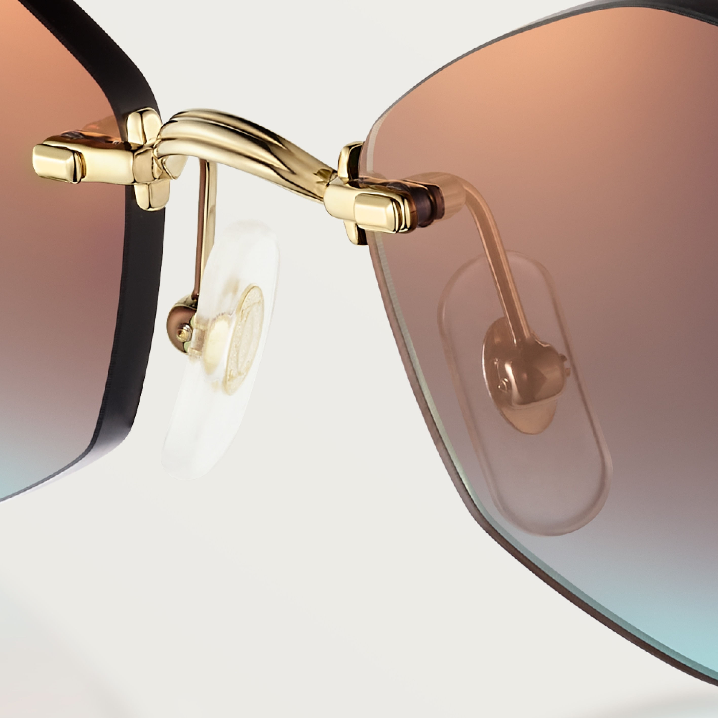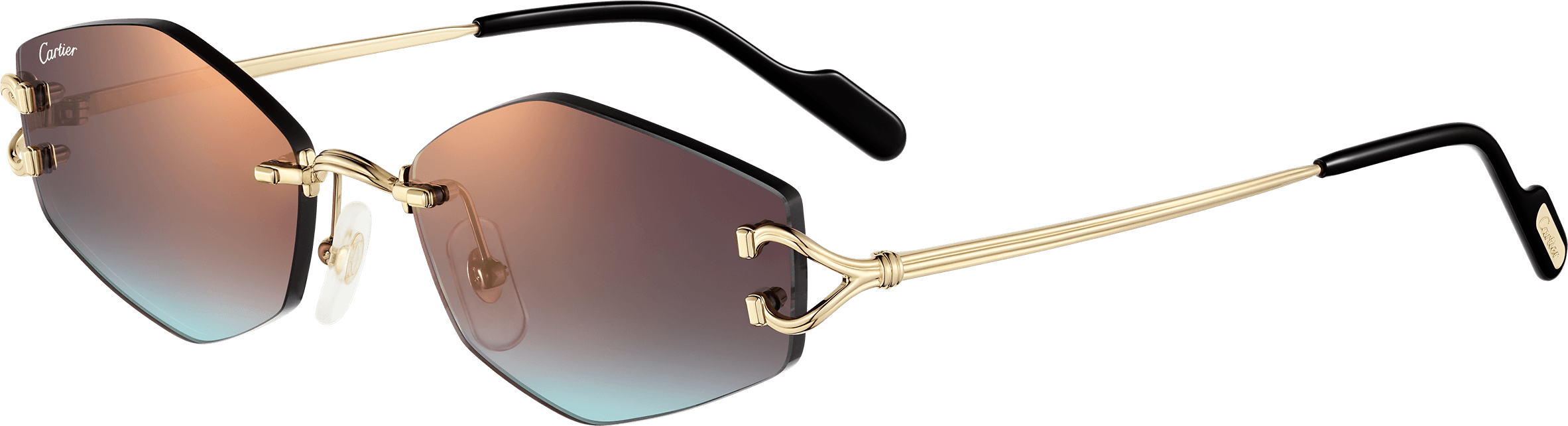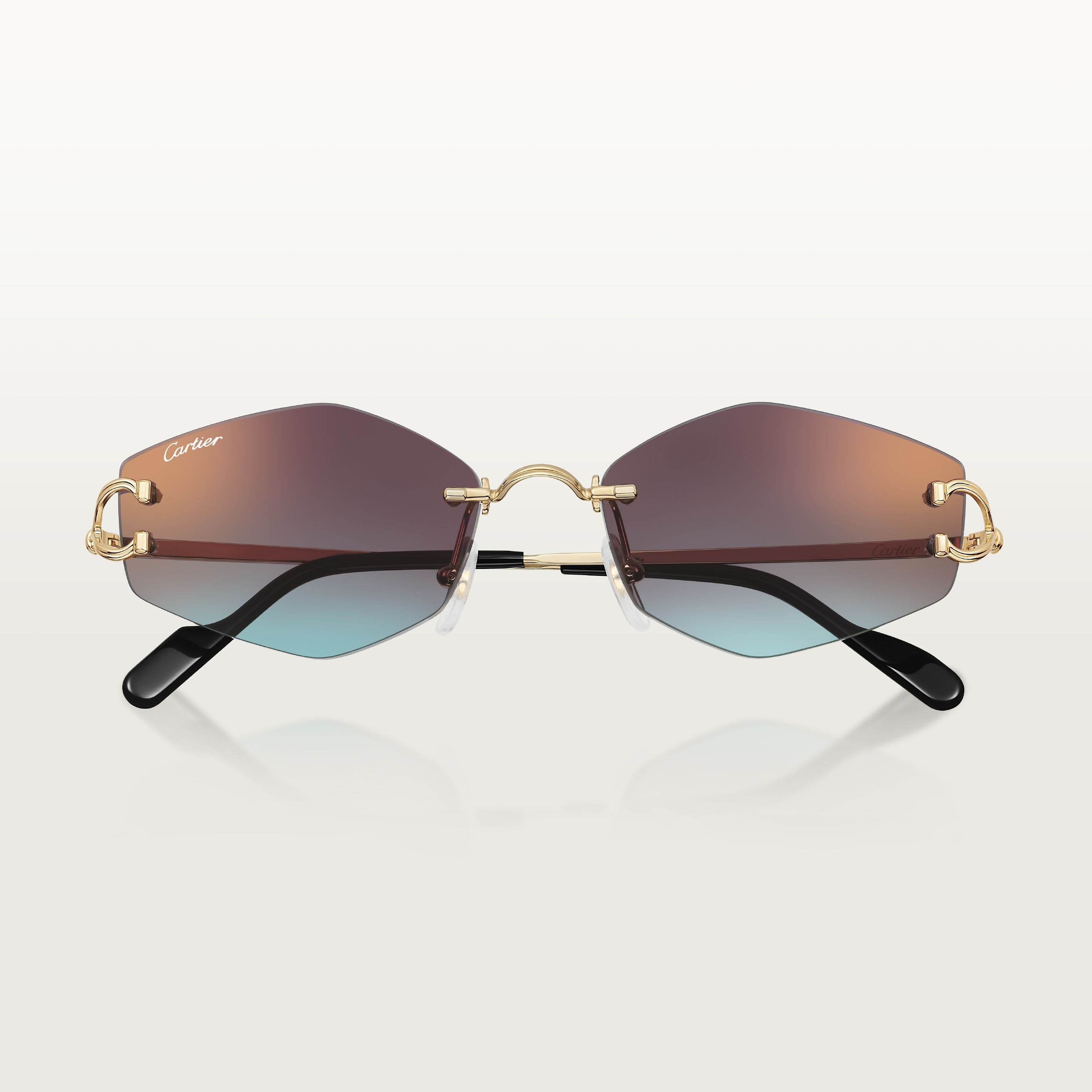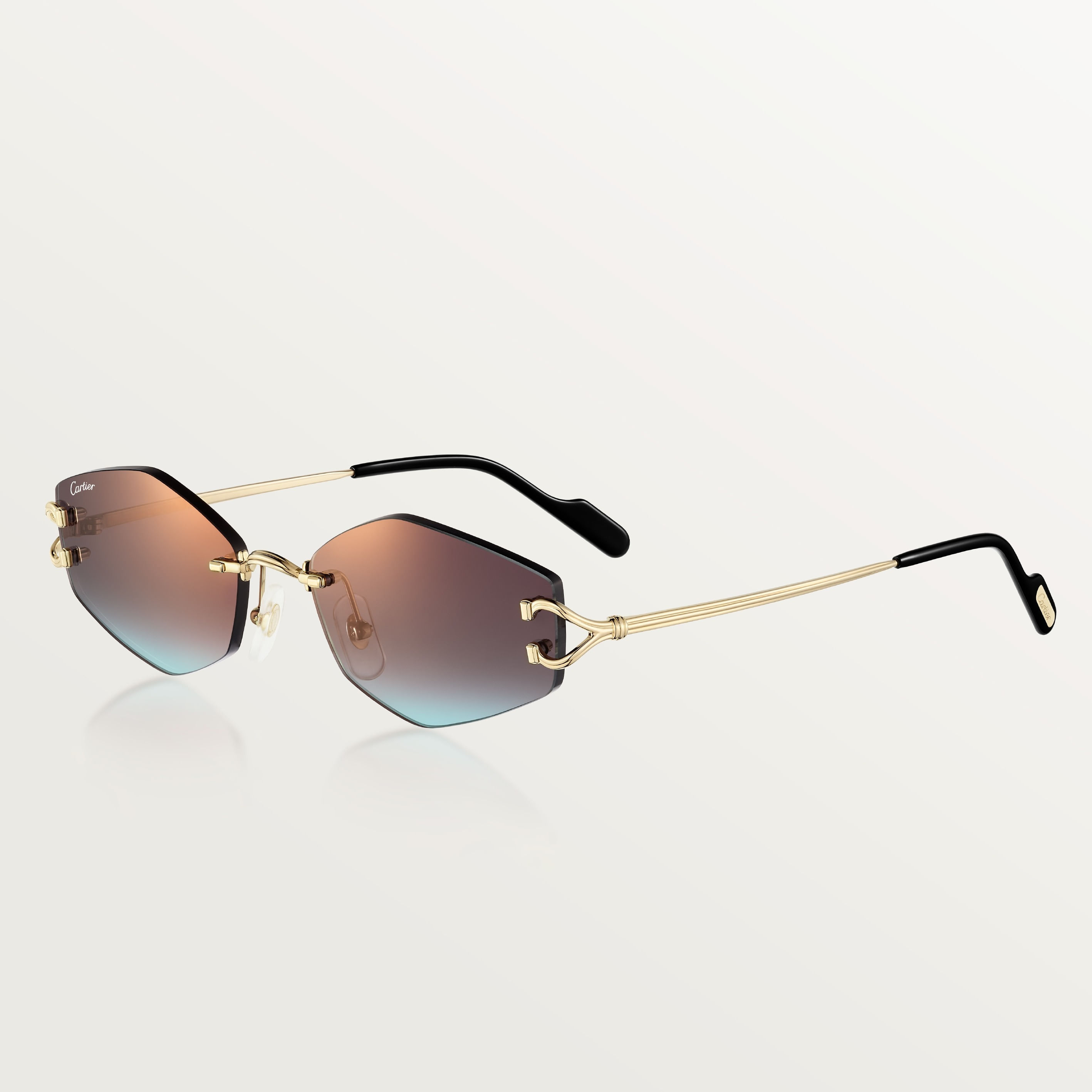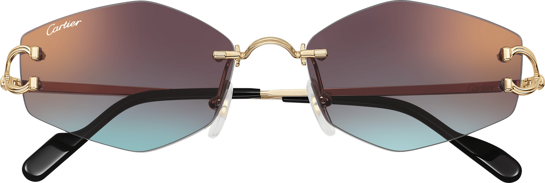 Gafas de sol Décor C Classique de Cartier de metal sin montura, acabado dorado liso, forma almendrada y lentes burdeos y azul degradado efecto espejo dorado. Dimensiones: lentes 56 mm, puente 18 mm, varillas 140 mm.
