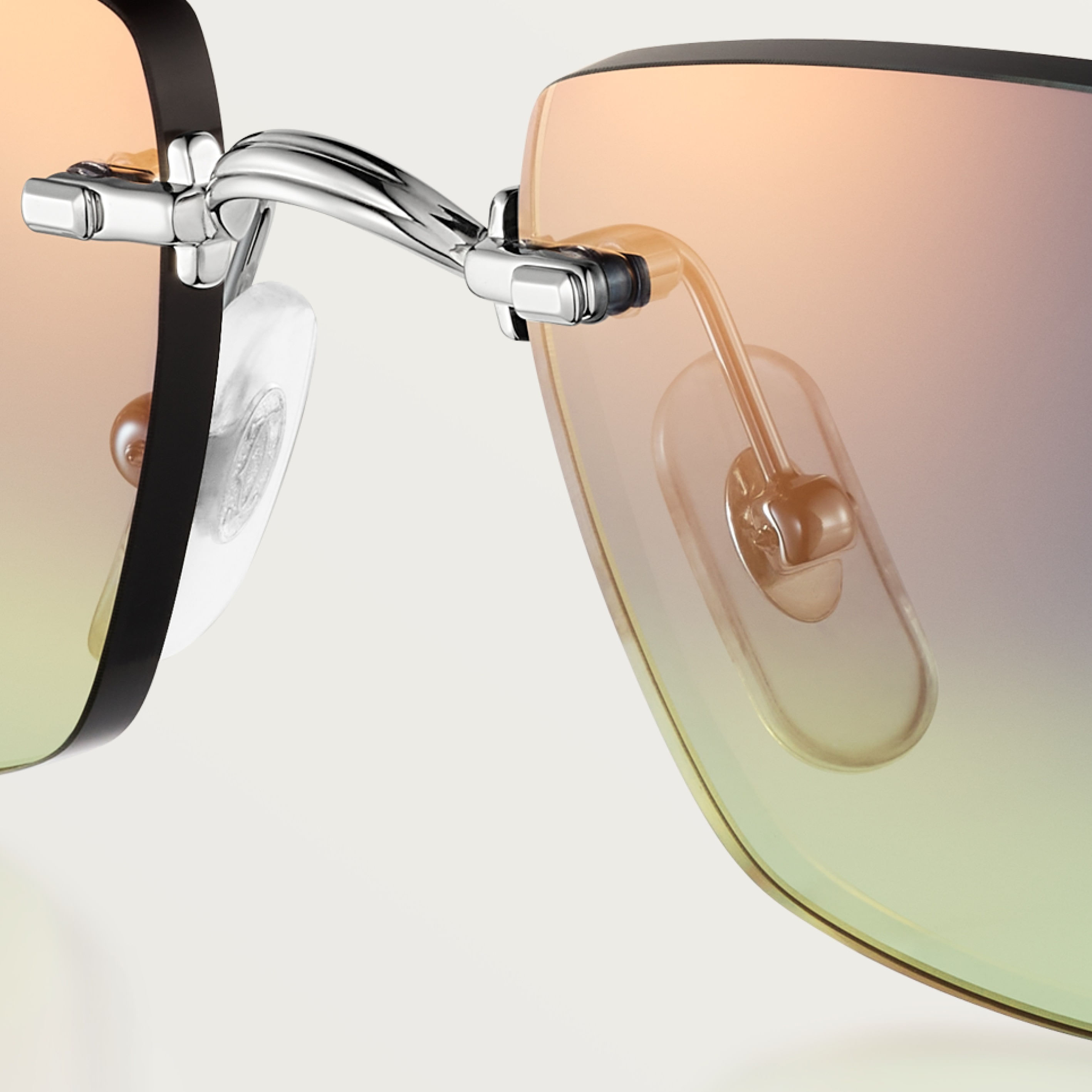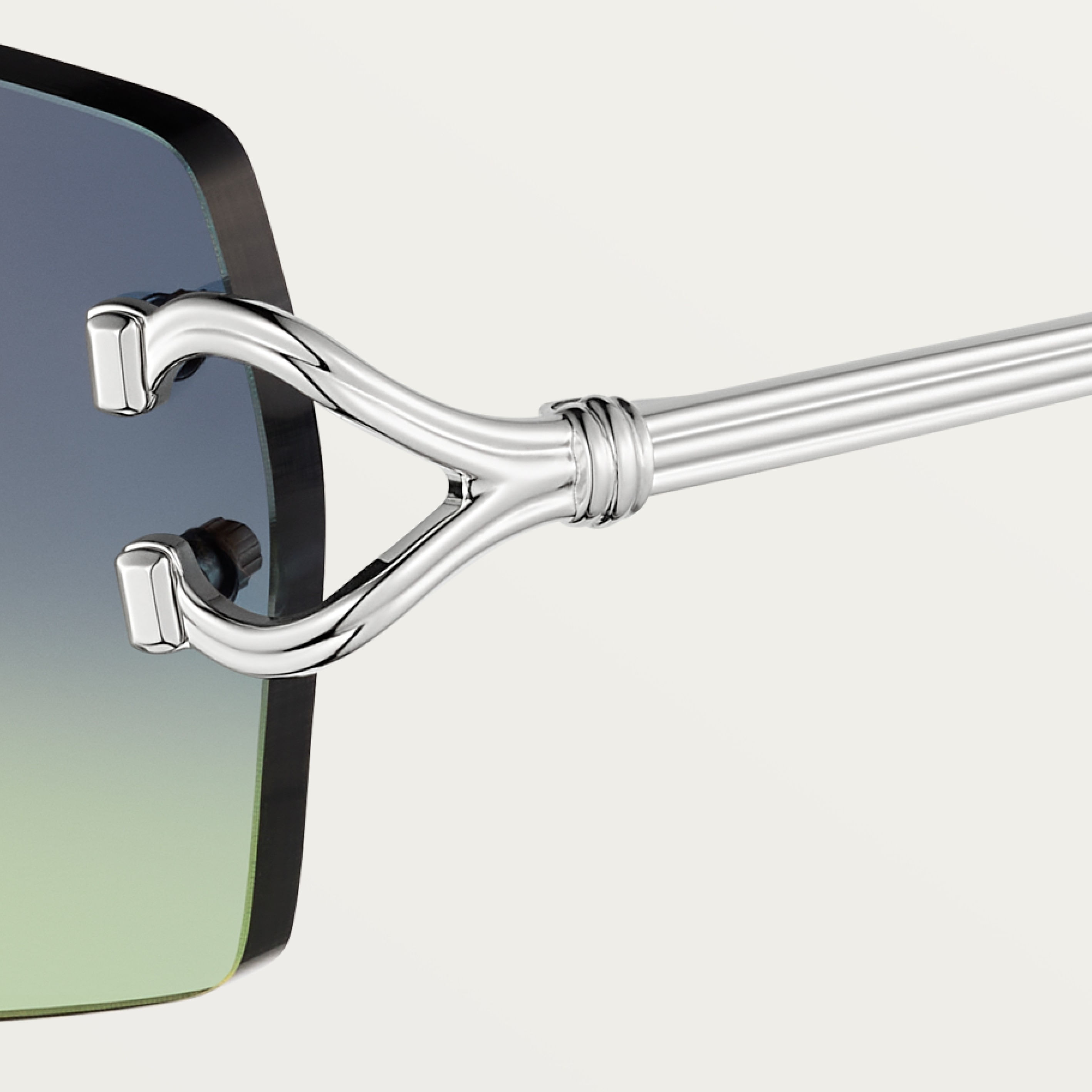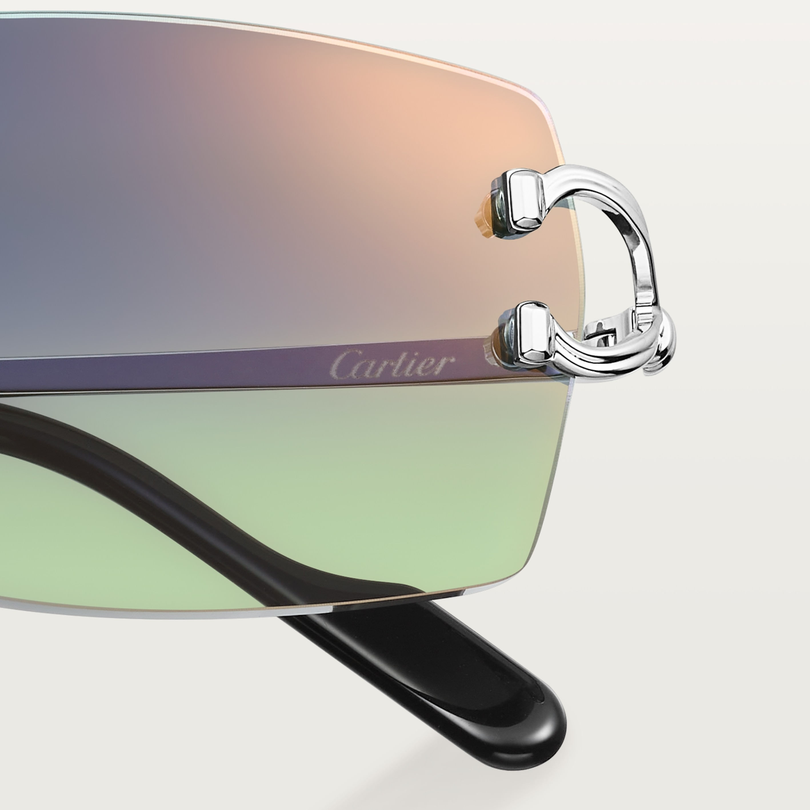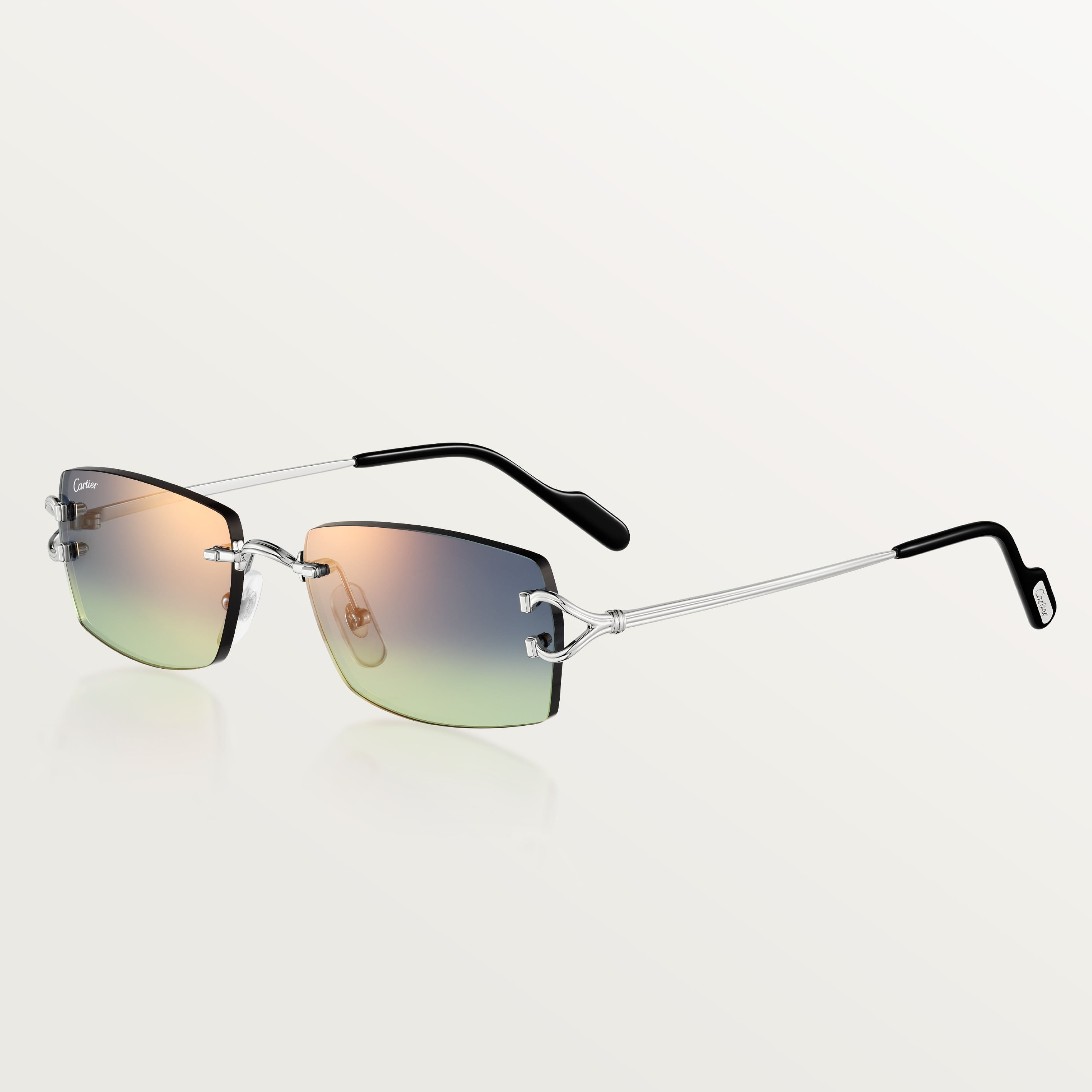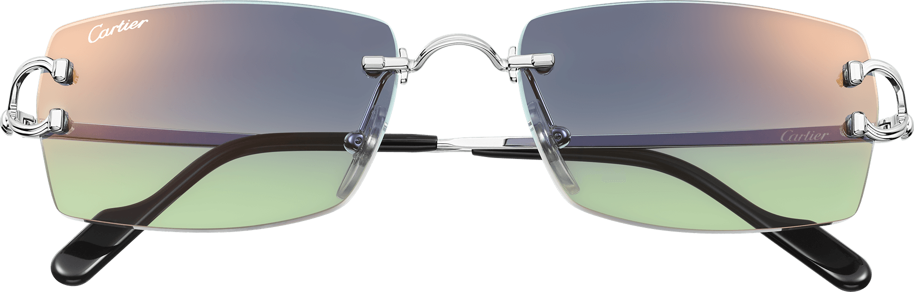 Gafas de sol Décor C Classique de Cartier de metal sin montura, acabado platino liso, forma rectangular y lentes azul y verde degradado efecto espejo dorado Dimensiones: lentes 56 mm, puente 18 mm, varillas 140 mm.