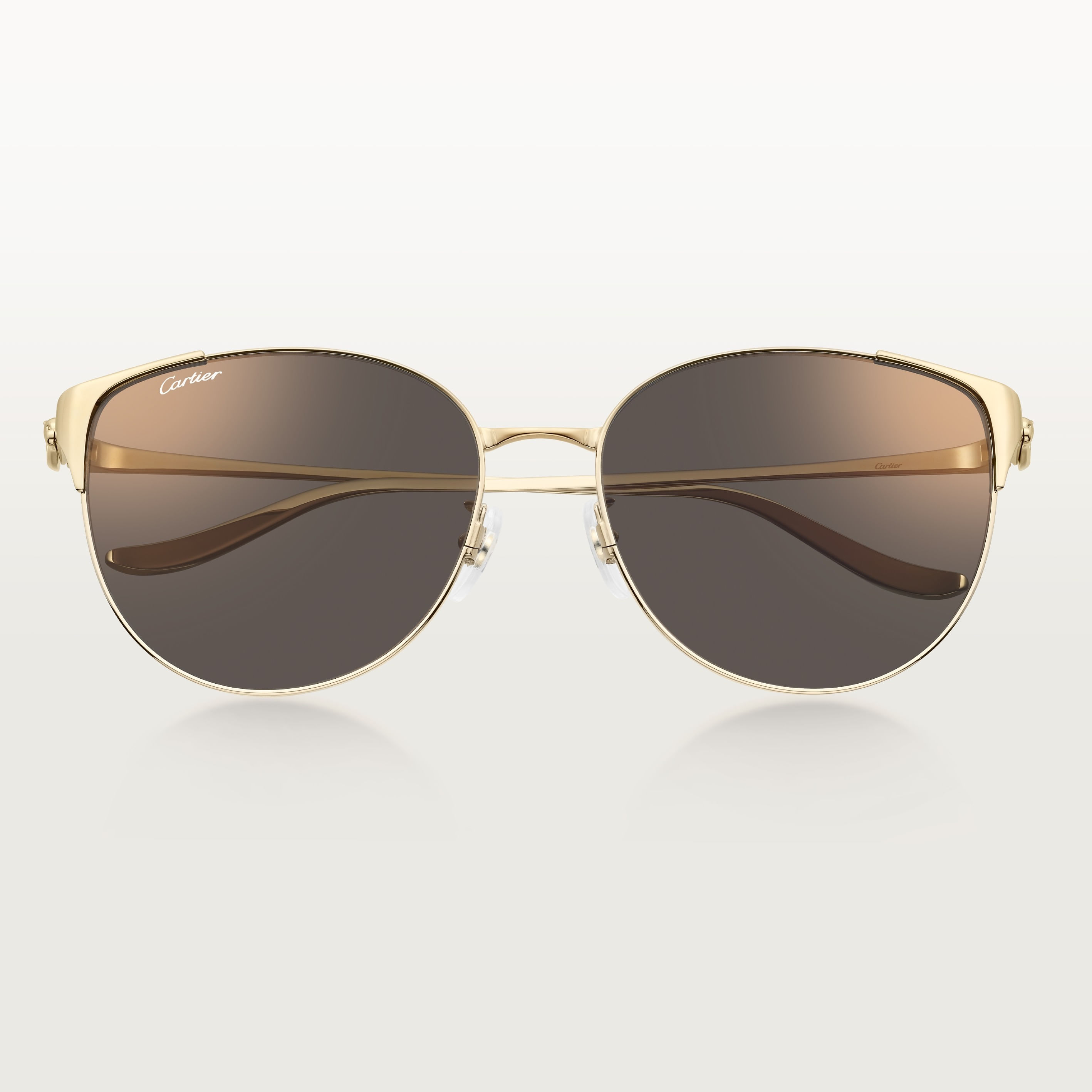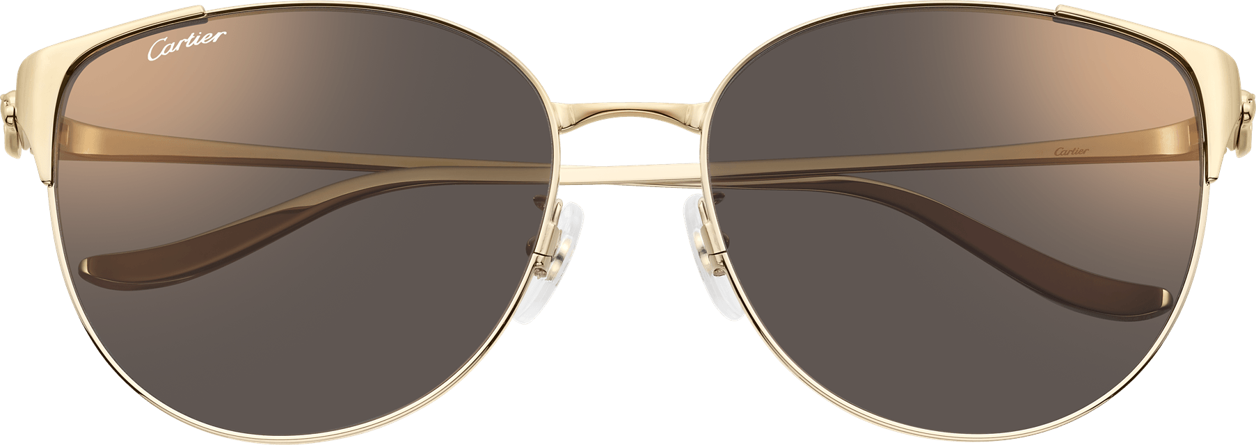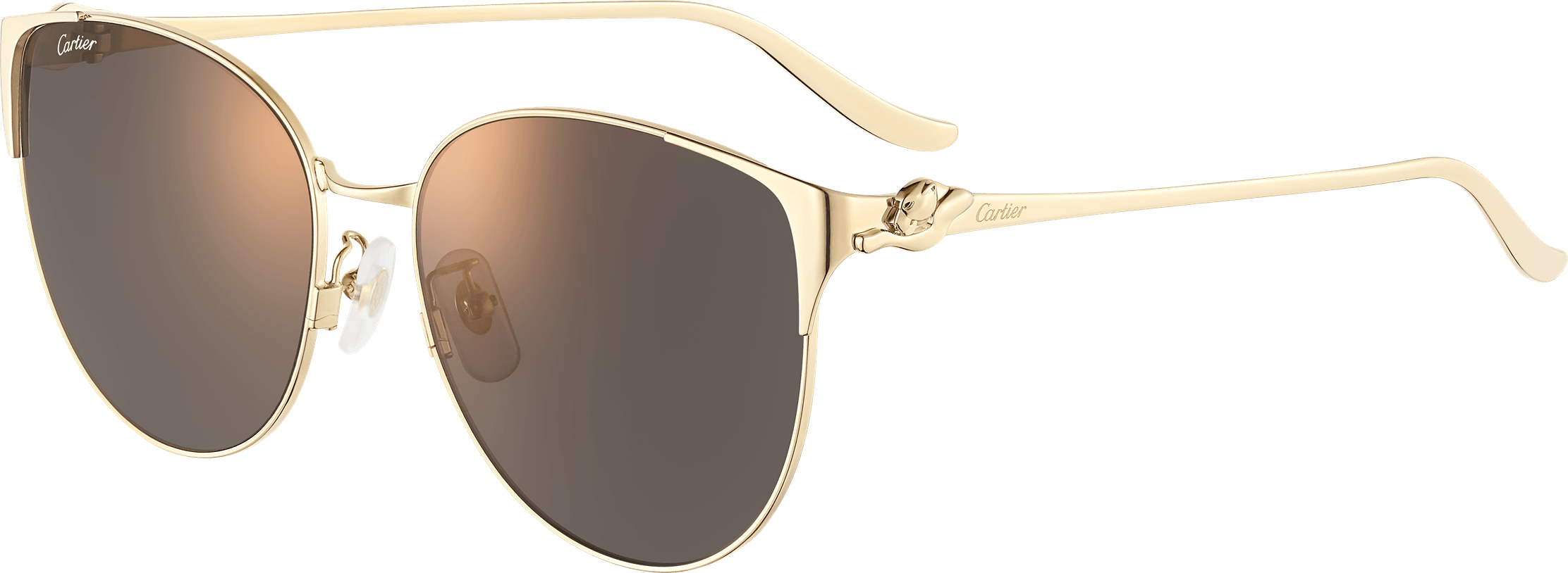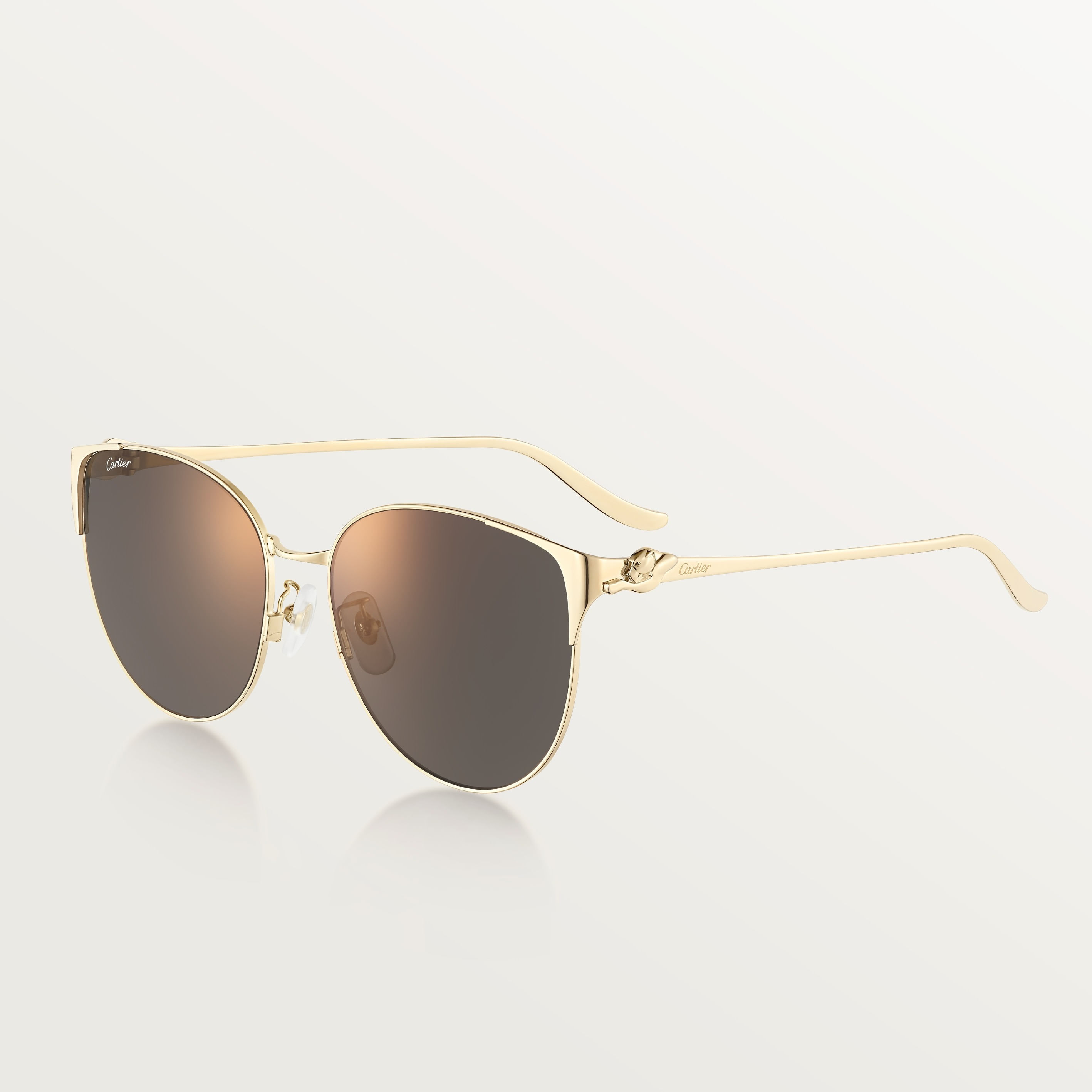Gafas de sol Panthère de Cartier con montura de metal, acabado dorado liso, forma de mariposa y lentes grises efecto espejo dorado. Ajuste asiático. Dimensiones: lentes 60 mm, puente 17 mm, varillas 140 mm.