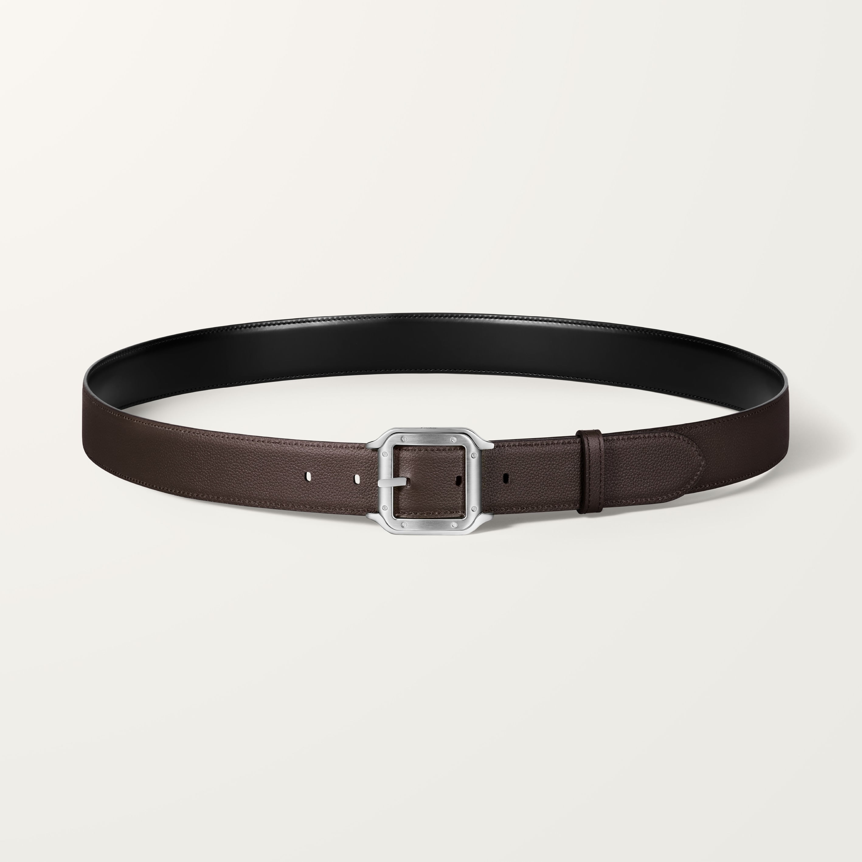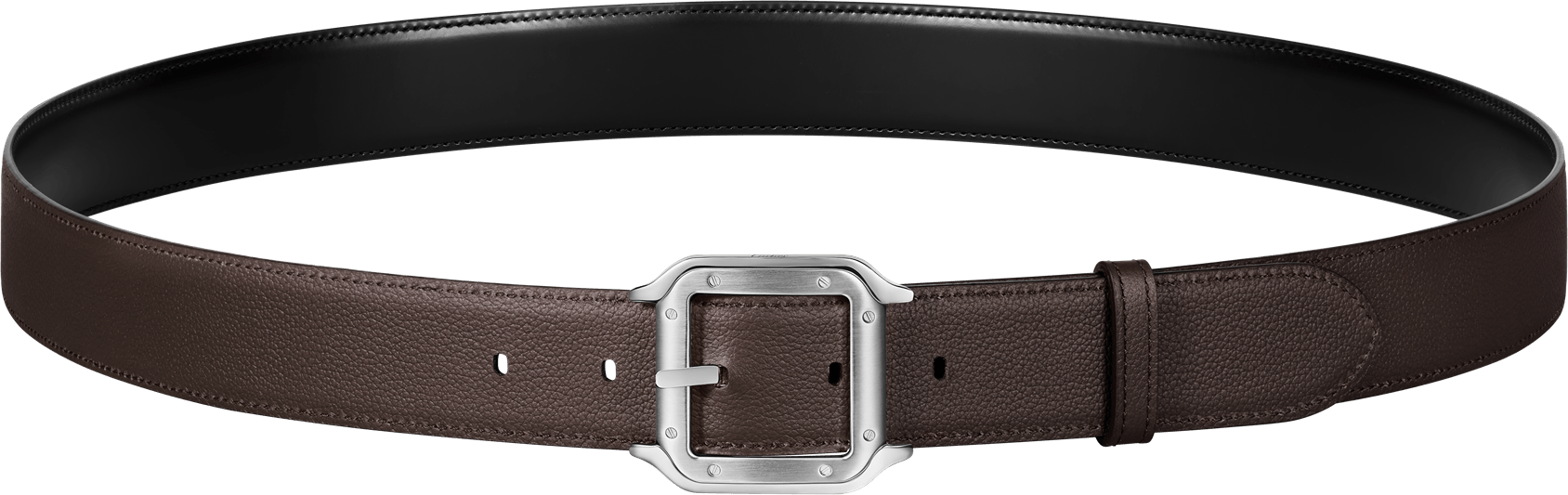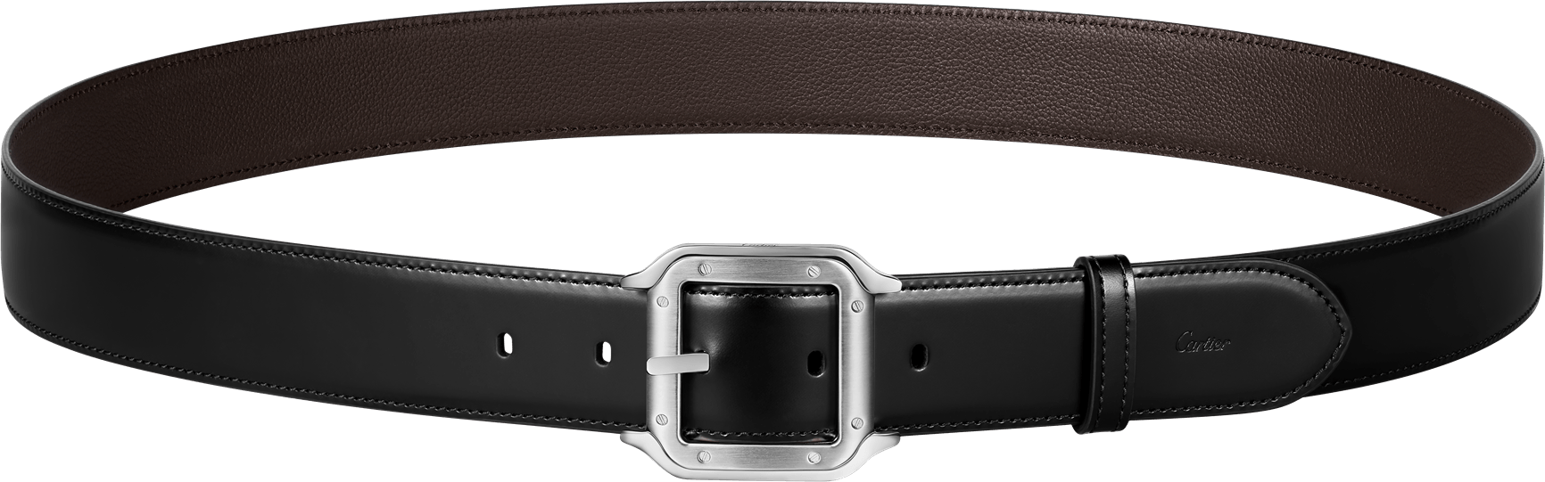 Cinturón con hebilla acabado paladio, firma Cartier. Correa reversible de piel de ternera color negro y marrón, marca Cartier grabada.