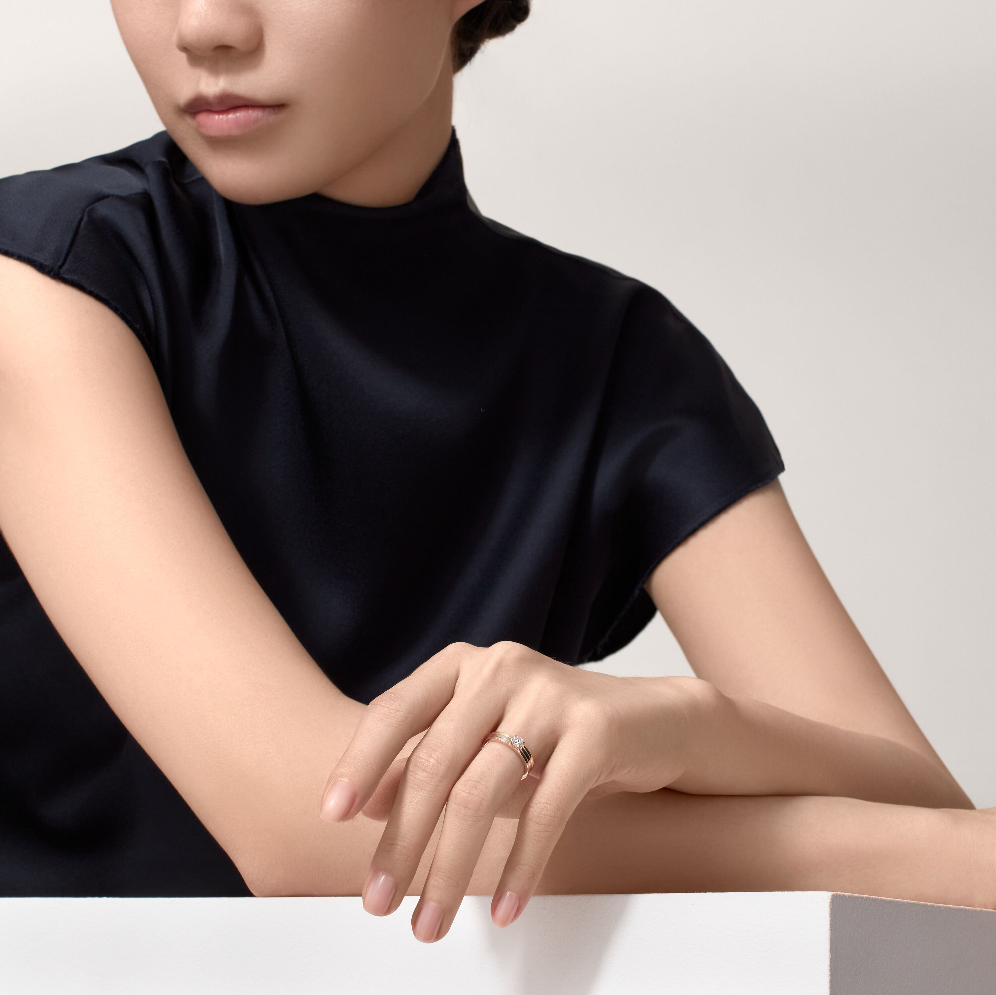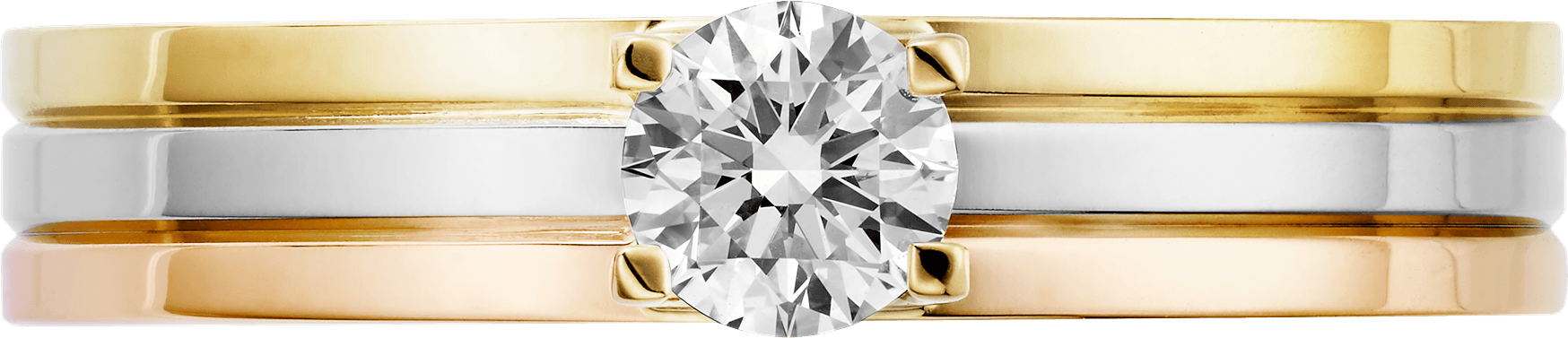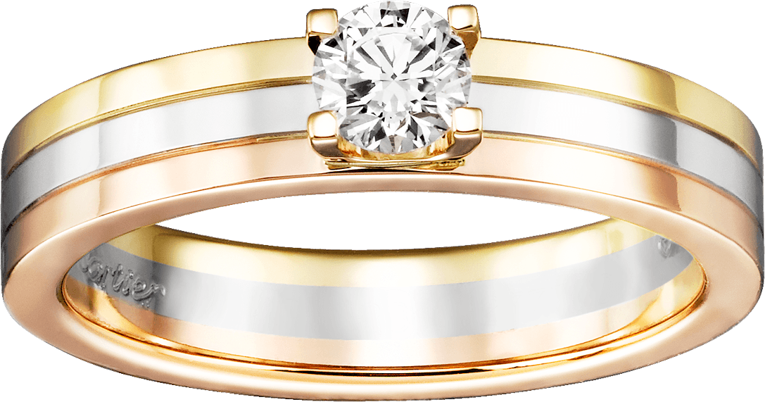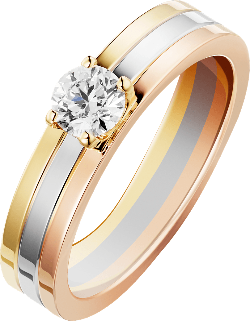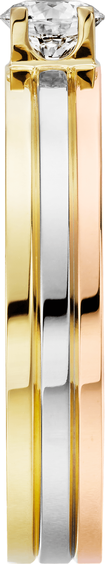 Solitario Vendôme Louis Cartier, oro blanco 750/1000, oro rosa 750/1000 y oro amarillo 750/1000, engastado con un diamante central talla brillante disponible de 0,23 a 0,29 quilates. Oro blanco, oro amarillo, oro rosa, diamante