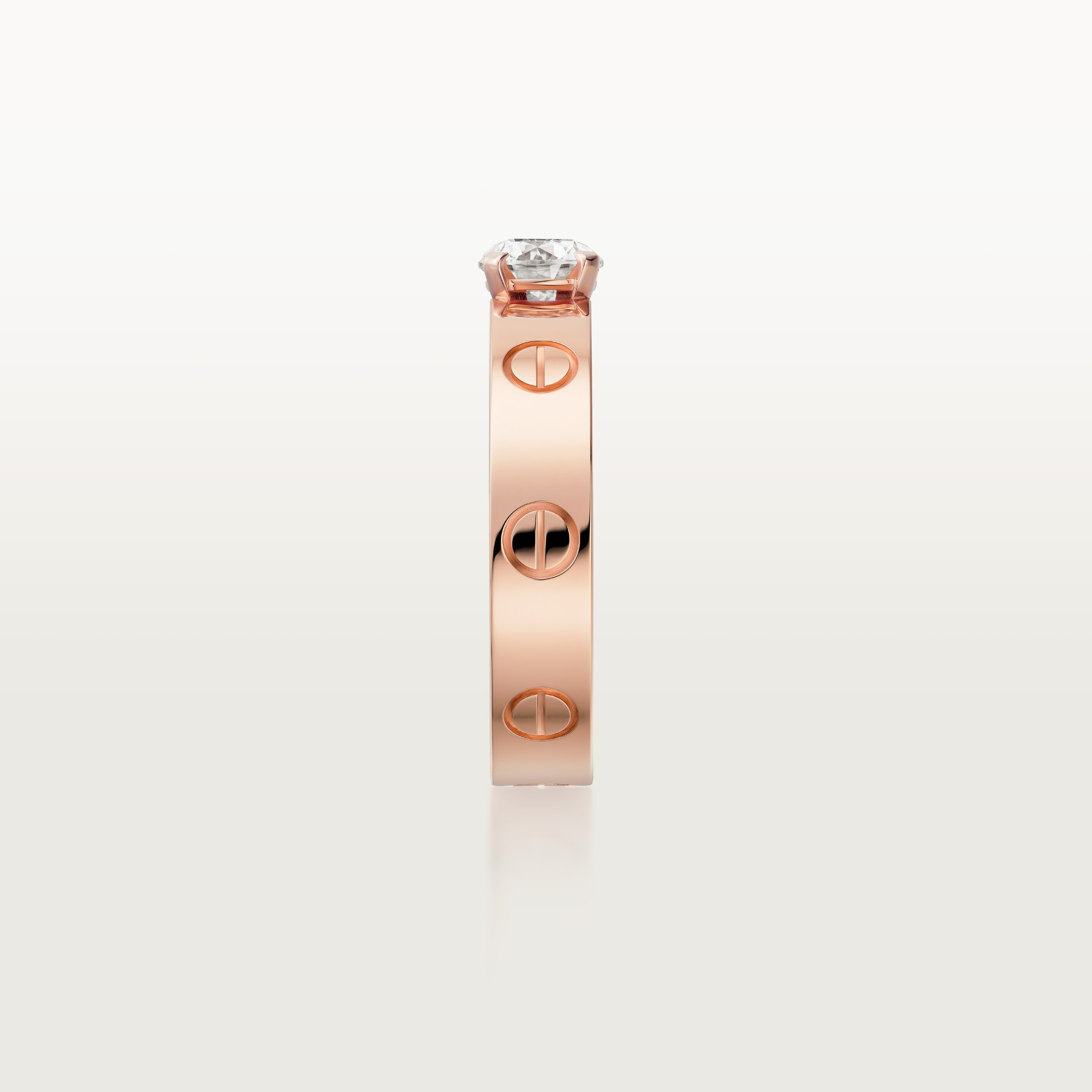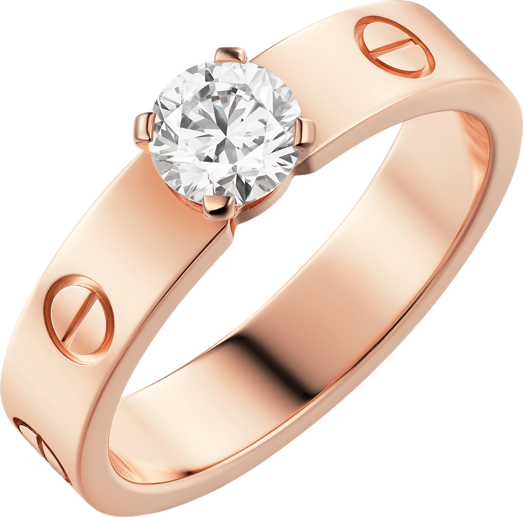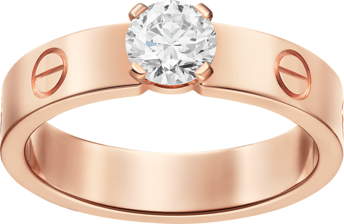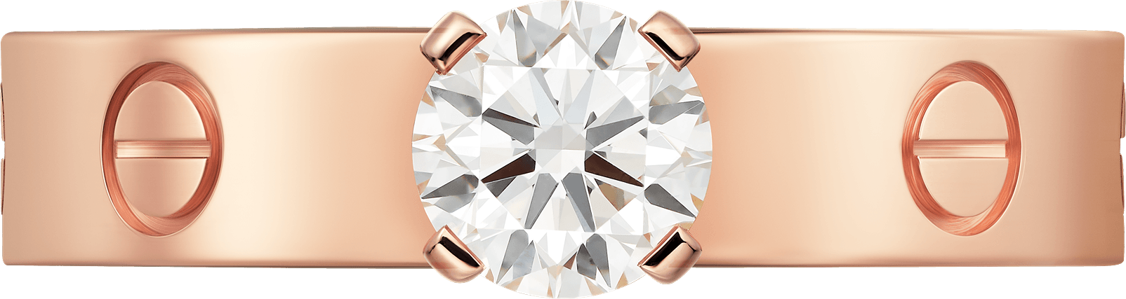 El origen de la colección LOVE es la emblemática pulsera creada en Nueva York en 1969. Reconocemos esta pulsera ovalada, expresión de la visión del diseño de Cartier, por su motivo radical e innovador, que se atreve a mostrar los tornillos. Más allá de su diseño, LOVE es una colección manifiesto que sella los sentimientos. Solitario Love, oro rosa 750/1000, engastado con un diamante talla brillante disponible de 0,23 a 0,49 quilates. Oro rosa, diamante