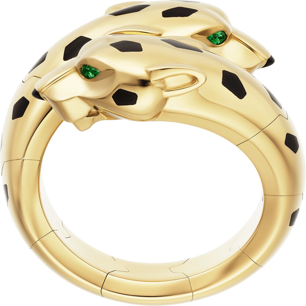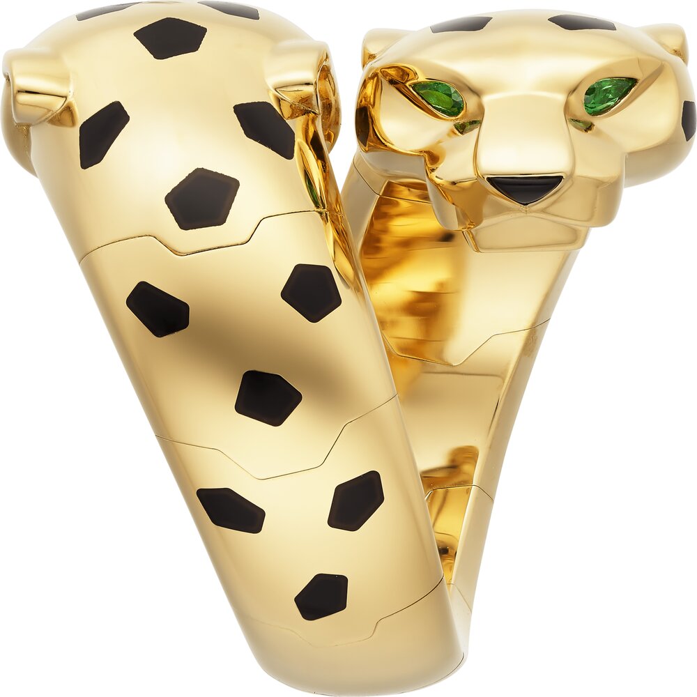 Anillo Panthère de Cartier, oro amarillo 750/1000, ónix, laca negra, engastado con 4 granates tsavoritas (para la talla 52)..