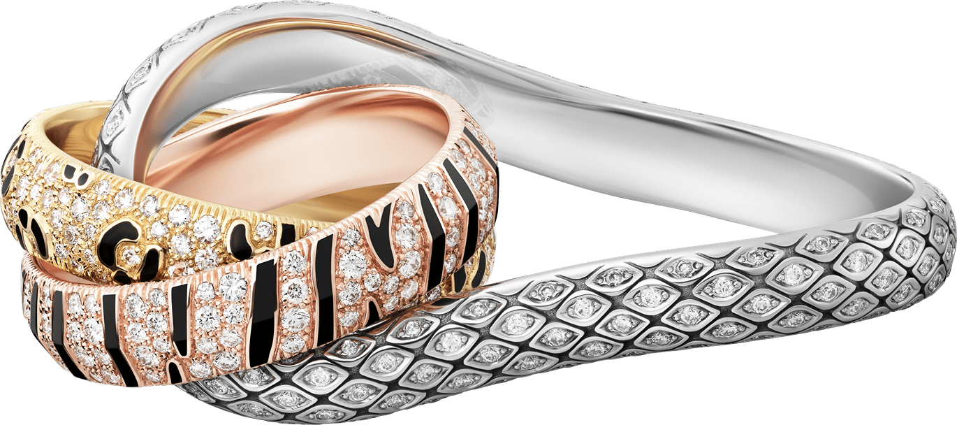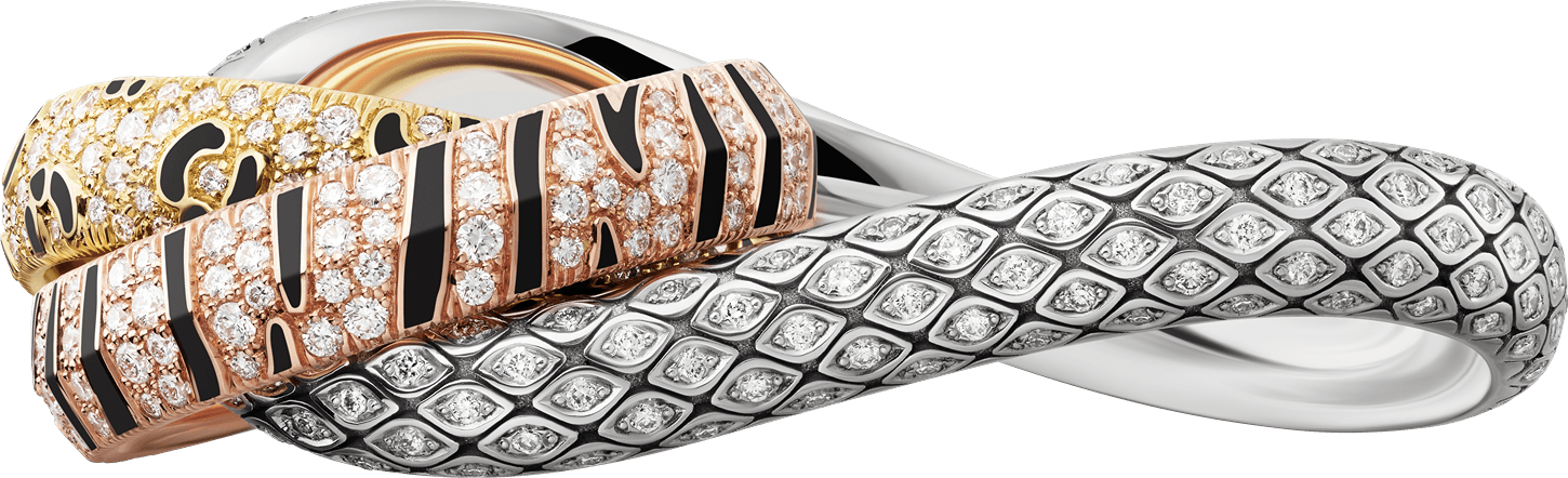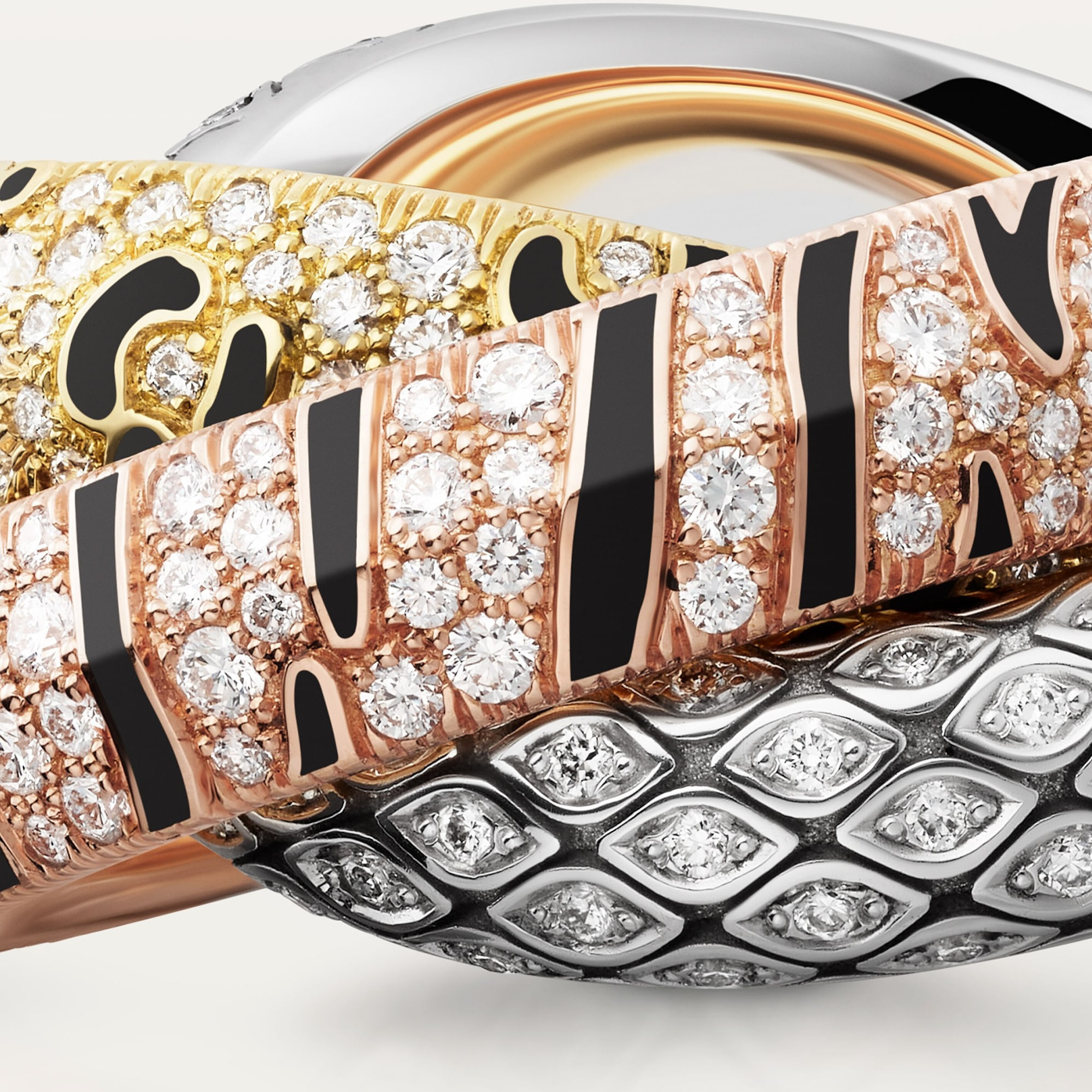 Anillo Trinity, oro blanco 750/1000, oro rosa 750/1000, oro amarillo 750/1000, laca negra, engastado con 428 diamantes talla brillante con un total de 1,82 quilates. Oro amarillo, oro rosa, oro blanco, laca, diamantes