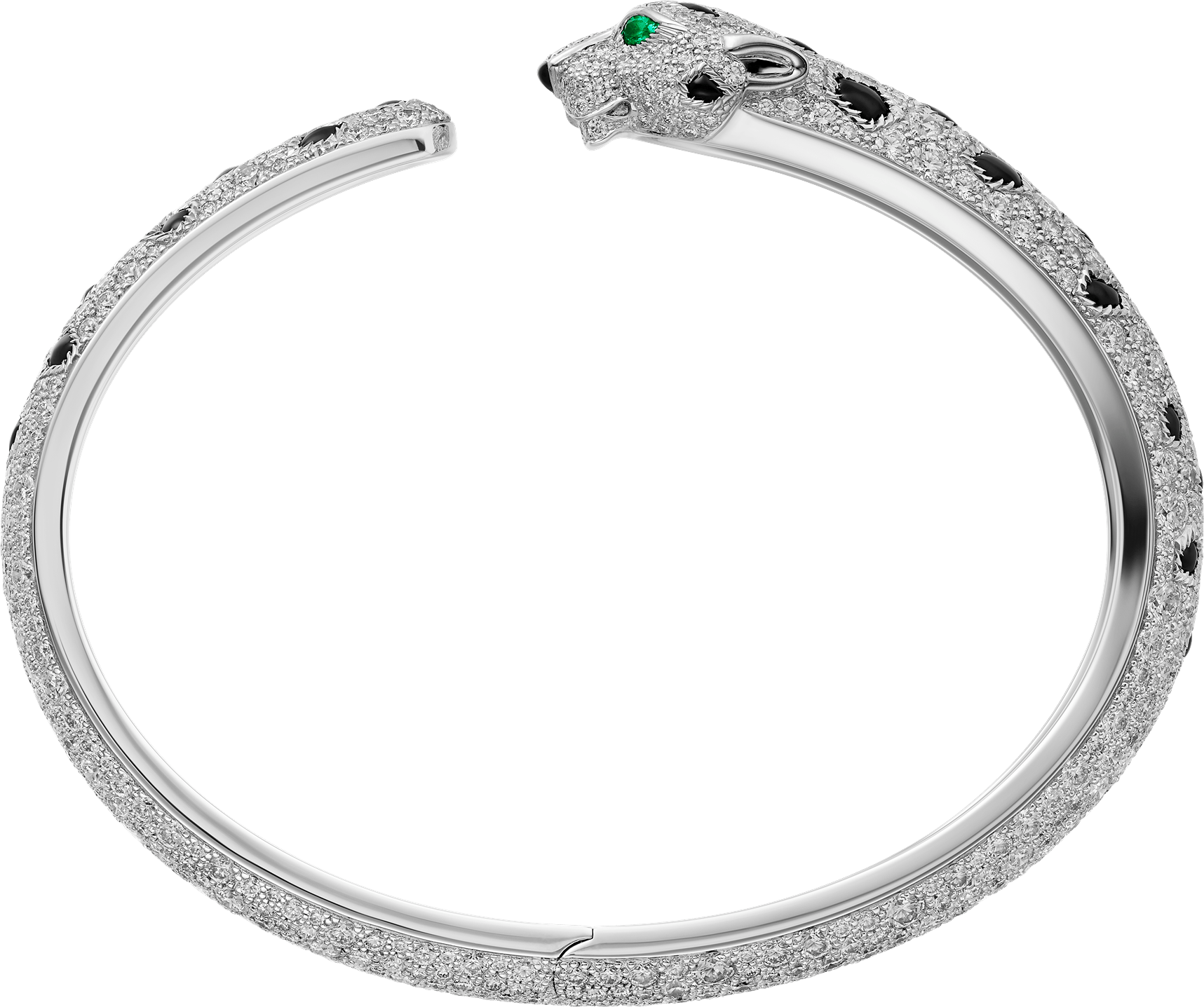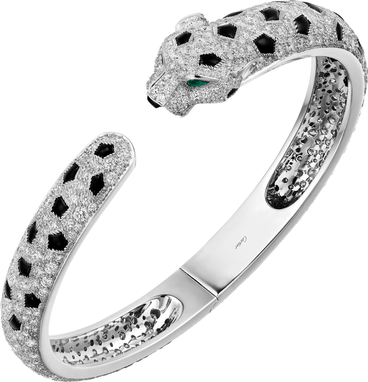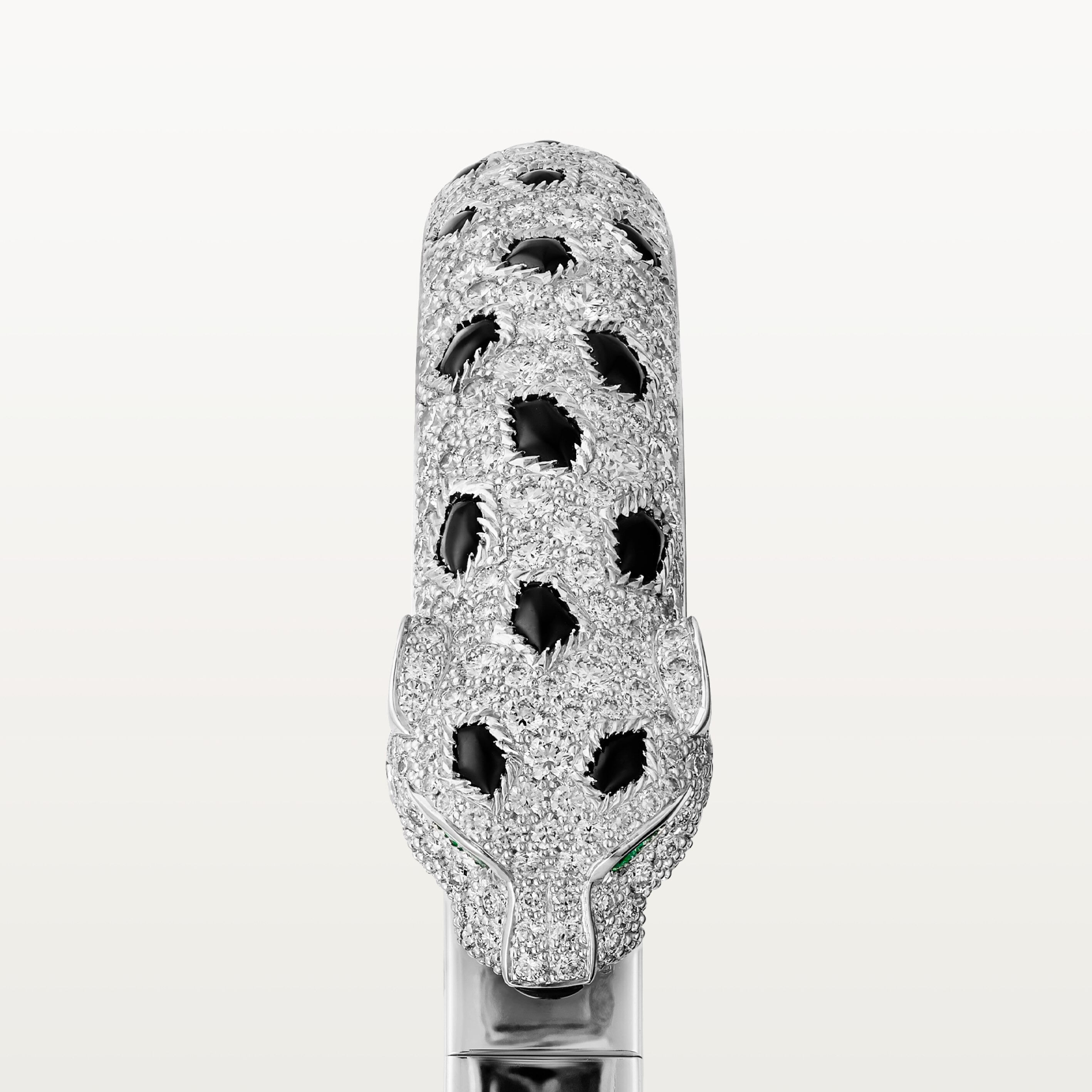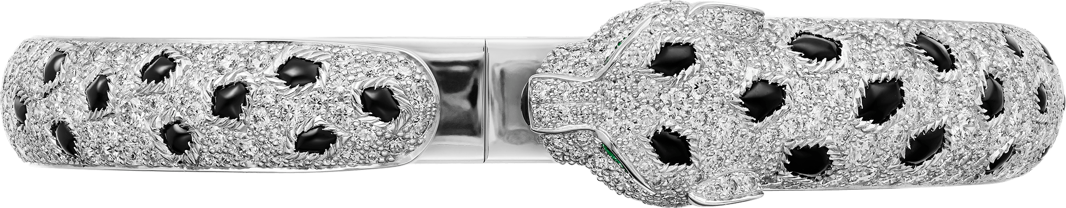 Pulsera Panthère de Cartier, oro blanco 750/1000, ónix, engastada con 2 esmeraldas y 647 diamantes talla brillante con un total de 7,56 quilates. Ancho: 8,33 mm. Grosor: 4,7 mm (para la talla 17). Oro blanco, esmeraldas, ónix, diamantes