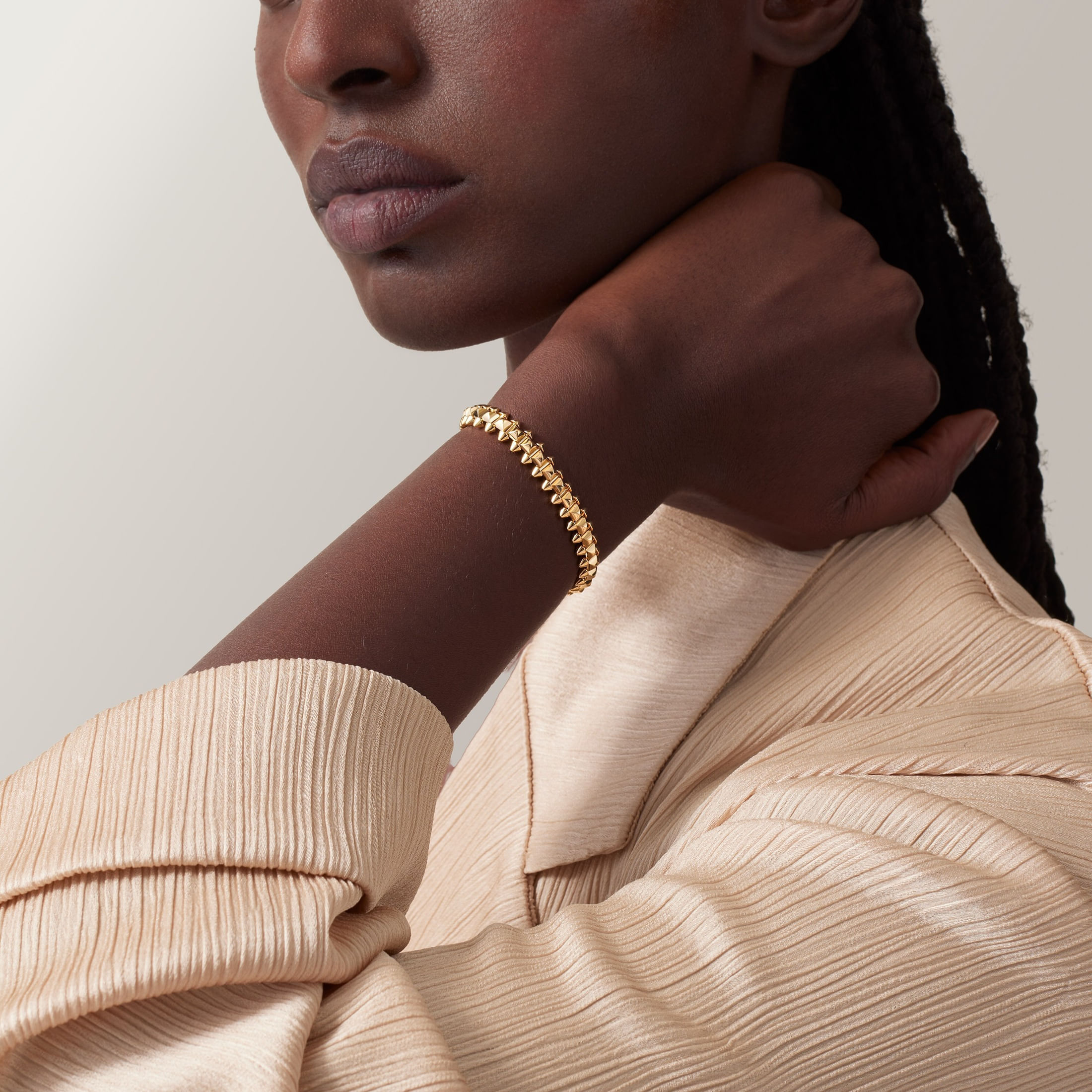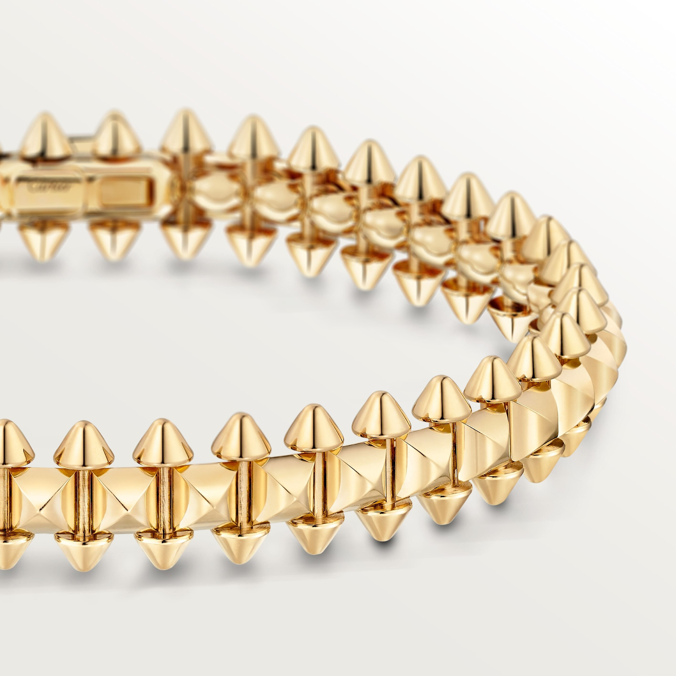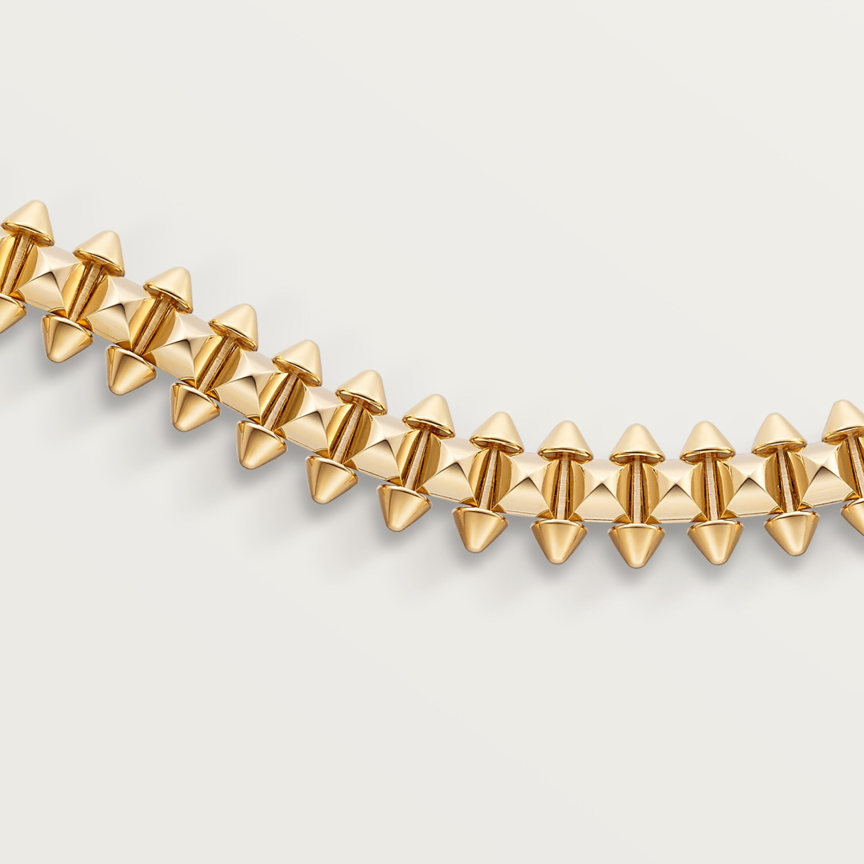 Clash de Cartier renueva el patrimonio estético de la Maison. Picots, cuentas y clous carrés componen la distintiva malla geométrica y móvil de esta joya emblemática.