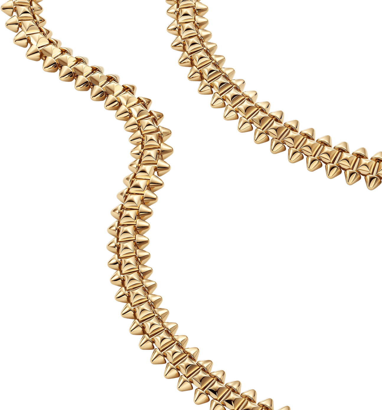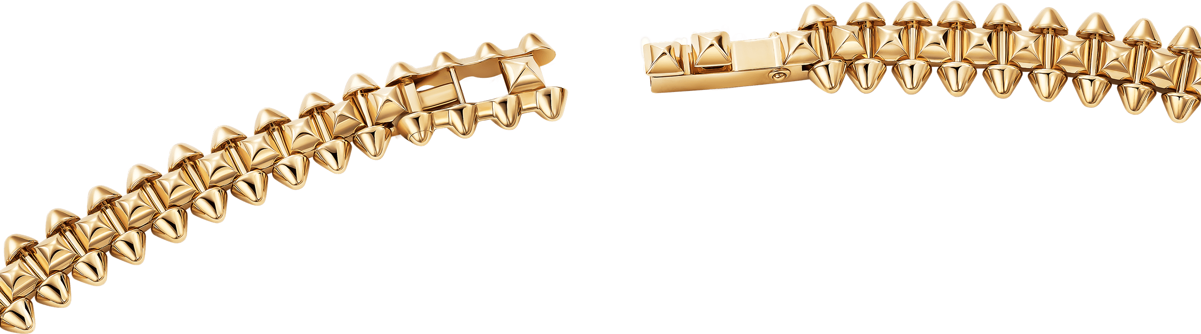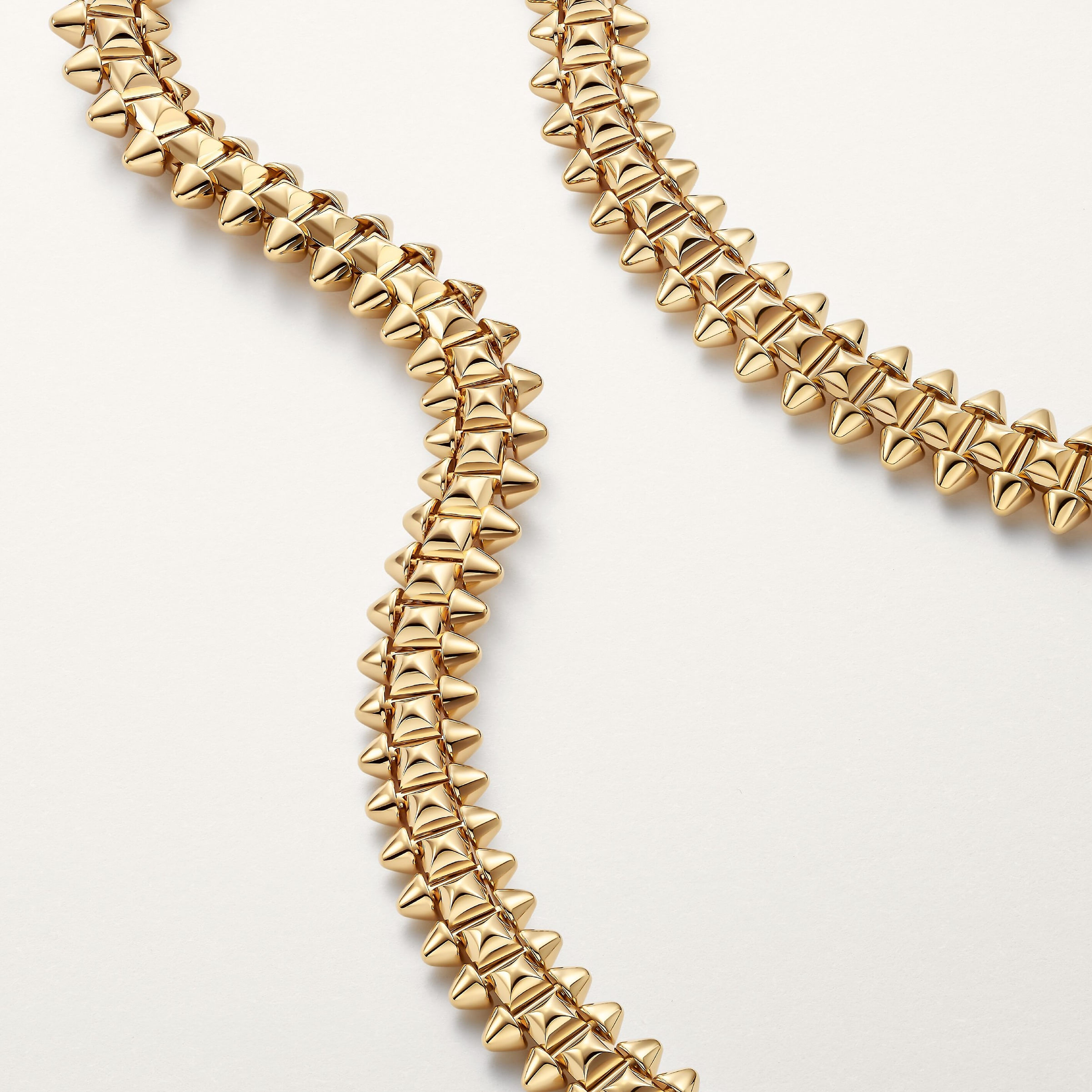 Clash de Cartier renueva el patrimonio estético de la Maison. Picots, cuentas y clous carrés componen la distintiva malla geométrica y móvil de esta joya emblemática.
